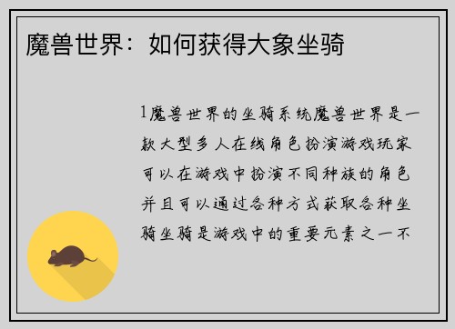 1. 魔兽世界的坐骑系统 魔兽世界是一款大型多人在线角色扮演游戏,玩家可以在游戏中扮演不同种族的角色,并且可以通过各种方式获取各种坐骑。坐骑是游戏中的重要元素之一,不仅可以提高玩家的移动速度,还可以展...