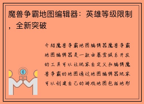 介绍魔兽争霸地图编辑器 魔兽争霸地图编辑器是一款由暴雪娱乐开发的工具,可以让玩家自定义和编辑魔兽争霸的地图。通过地图编辑器,玩家可以创建自己的游戏地图,包括地形、单位、技能、任务等等。其中一个重要的功...
