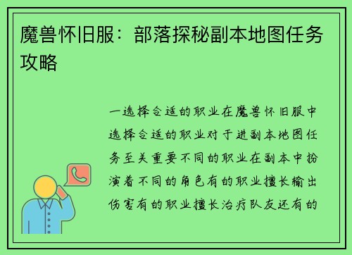 一、选择合适的职业 在魔兽怀旧服中,选择合适的职业对于进副本地图任务至关重要。不同的职业在副本中扮演着不同的角色,有的职业擅长输出伤害,有的职业擅长治疗队友,还有的职业可以承担坦克的角色。在选择职业时...
