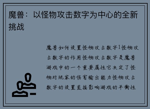 魔兽如何设置怪物攻击数字 1. 怪物攻击数字的作用 怪物攻击数字是魔兽游戏中的一个重要属性,它决定了怪物对玩家的伤害输出能力。怪物攻击数字的设置直接影响游戏的平衡性和难度,合理的设置可以提供有趣的挑战...